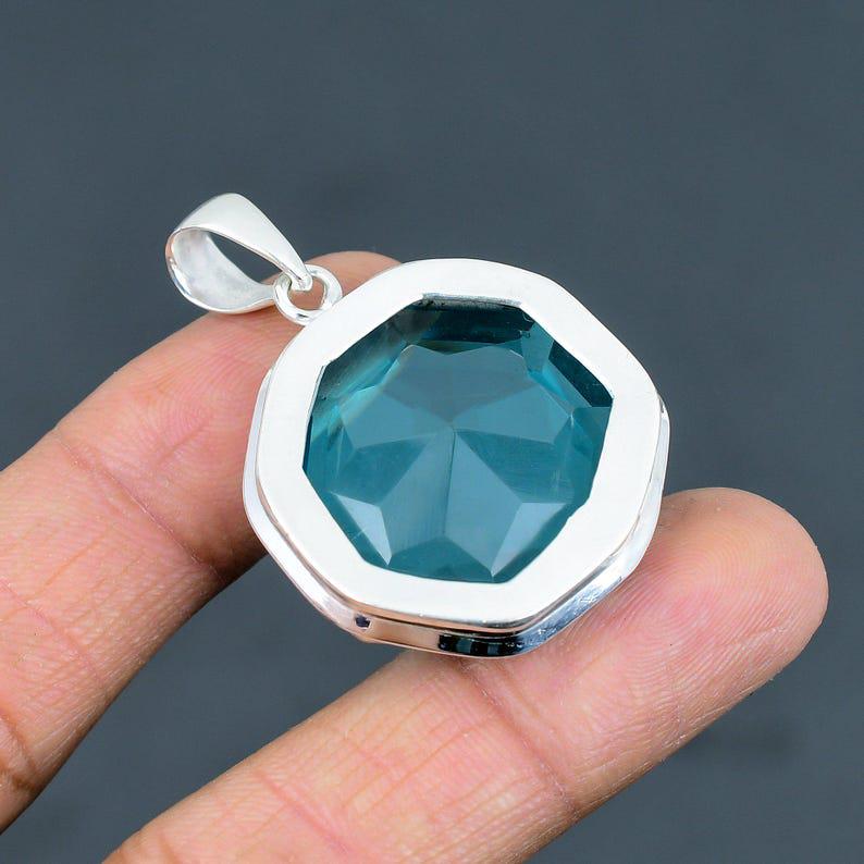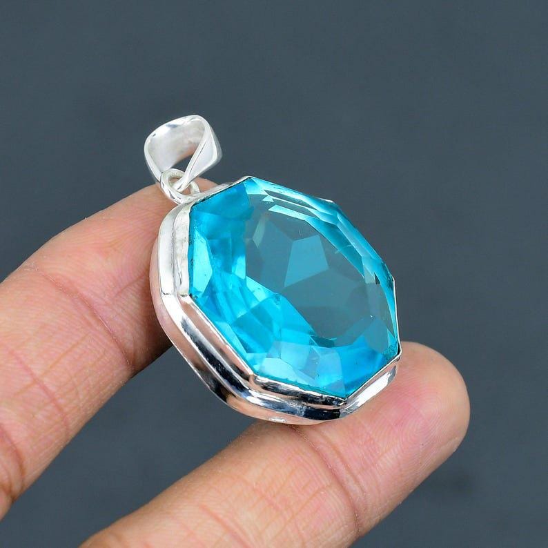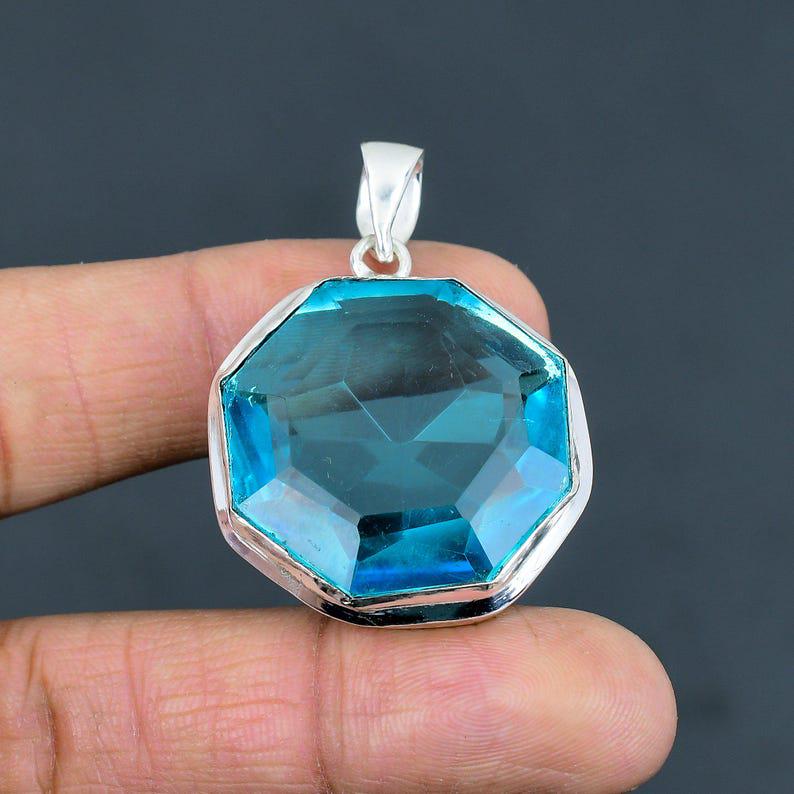Swiss Blue Topaz Octagon Pendant, 925 Sterling Silver Pendant, Handmade Pendant, Antique Pendant, Gemstone, Boho Jewelry, Gift For Women's