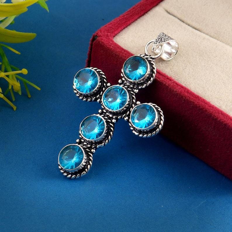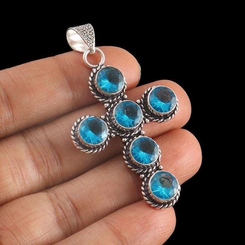 Topaz cross pendant, blue topaz pendant,925 sterling silver pendant,handmade cross pendant, gift for her/him,anniversary gift