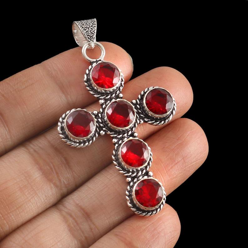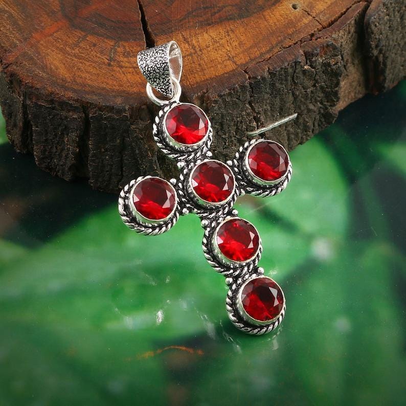 Garnet cross pendant,red garnet pendant,925 sterling silver pendant,handmade cross pendant, gift for her/him, anniversary gift