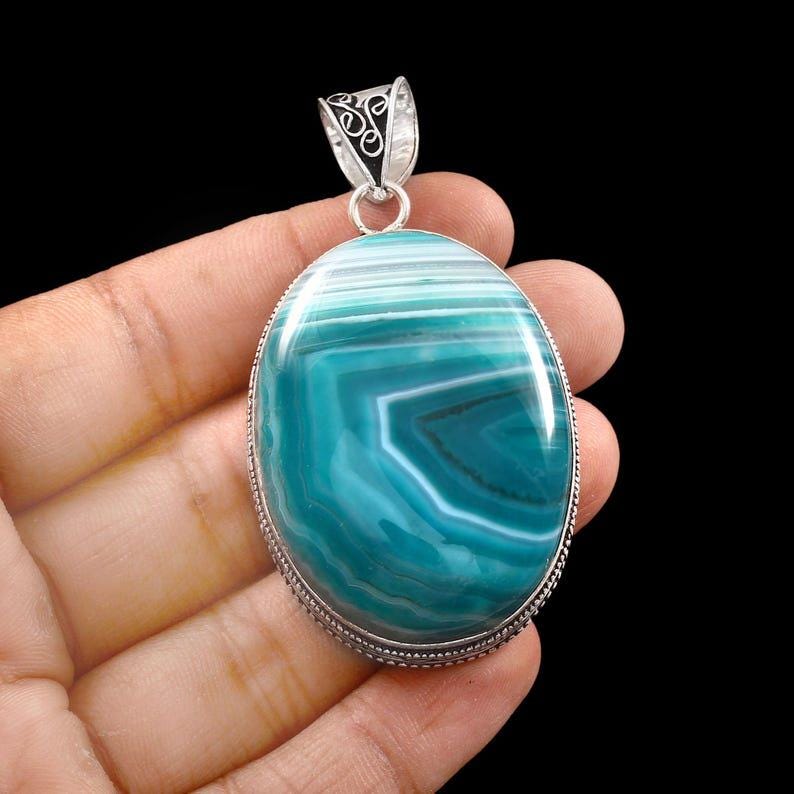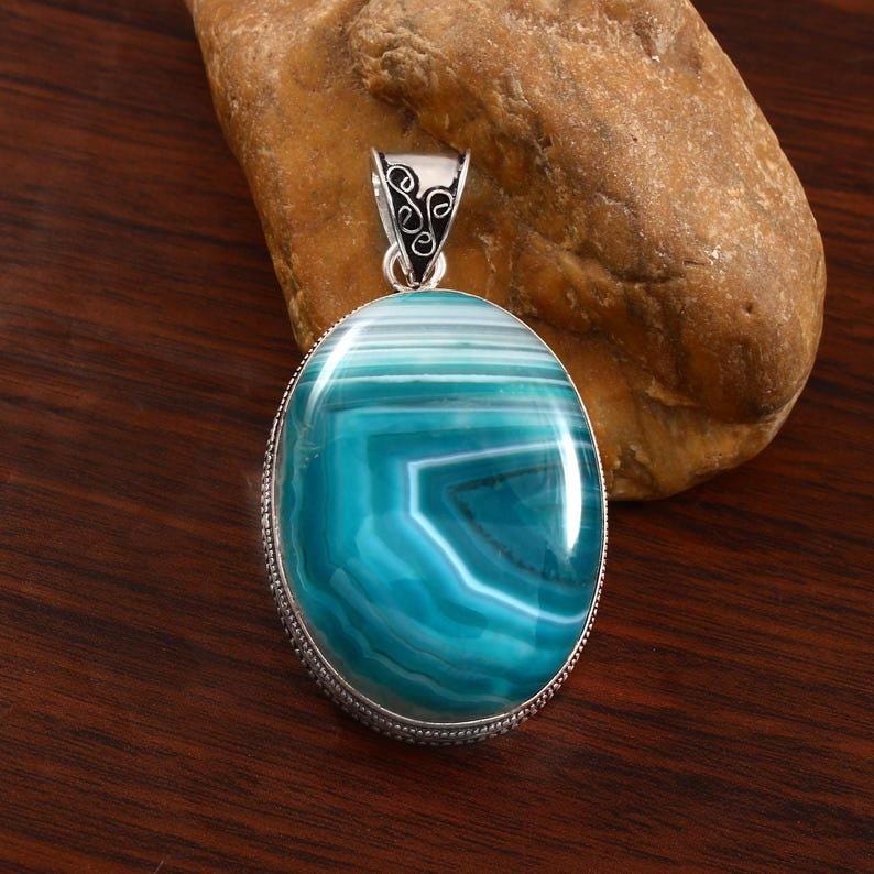 Green banded agate pendant, gemstone pendant, 925 sterling silver pendant, handmade pendant, agate jewelry, gift for her, christmas gift