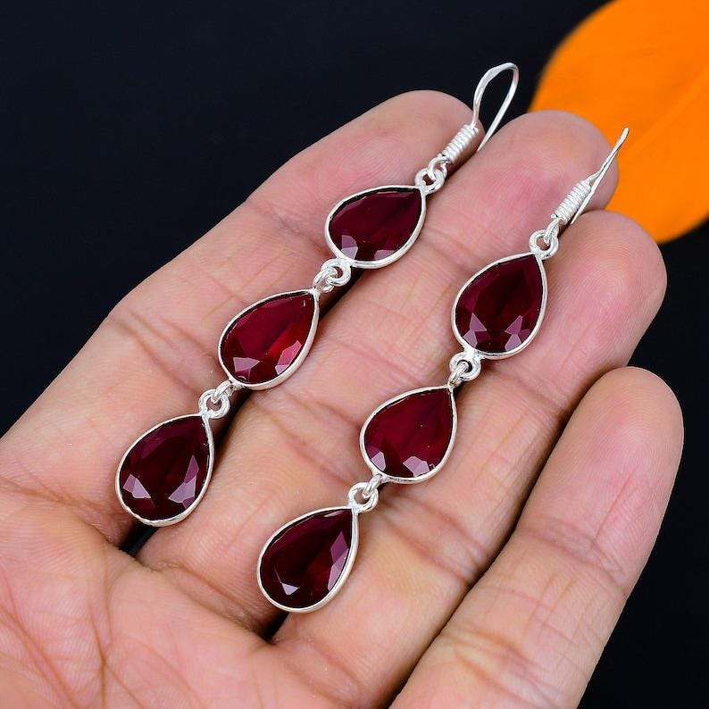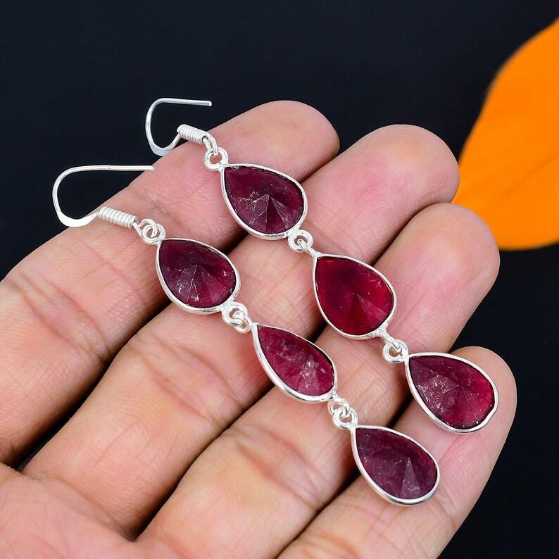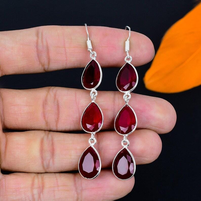 Red Ruby Earring, 925 Sterling Silver Handmade Earring Red Ruby Gemstone Earring Vintage Earring's Silver drop jewelry Birthday Gift For Him