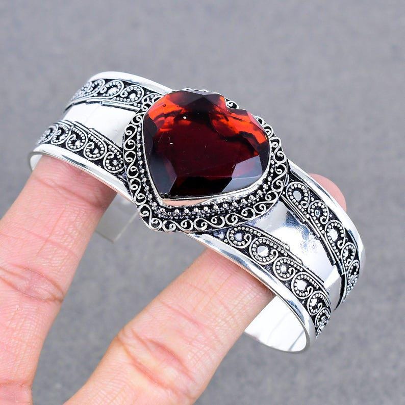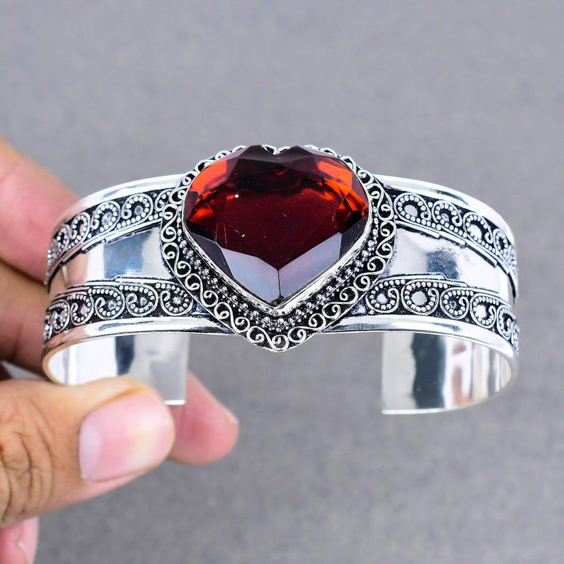 Red Garnet Gemstone Bangle 925 Sterling Silver Cuff Bracelet Women Bangle Bohemian Jewelry Handmade Bracelet Heart Shape Bracelet