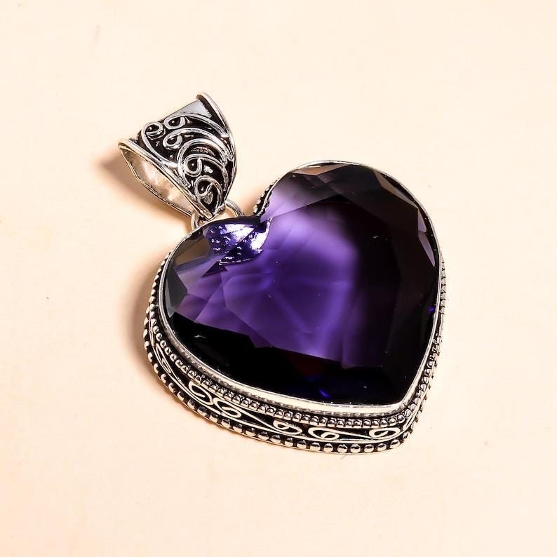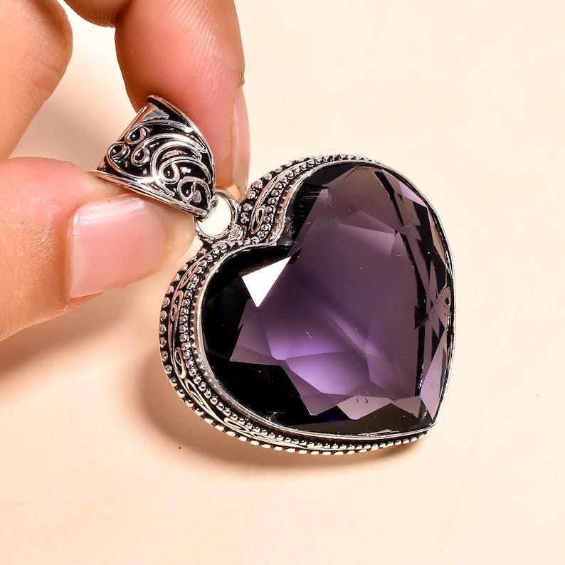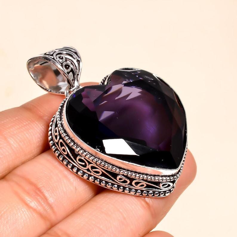 heart-shaped Amethyst Pendant | Handmade Silver Gemstone Jewelry | Unique Boho Crystal Pendant | Gift for Her | Statement Necklace"
