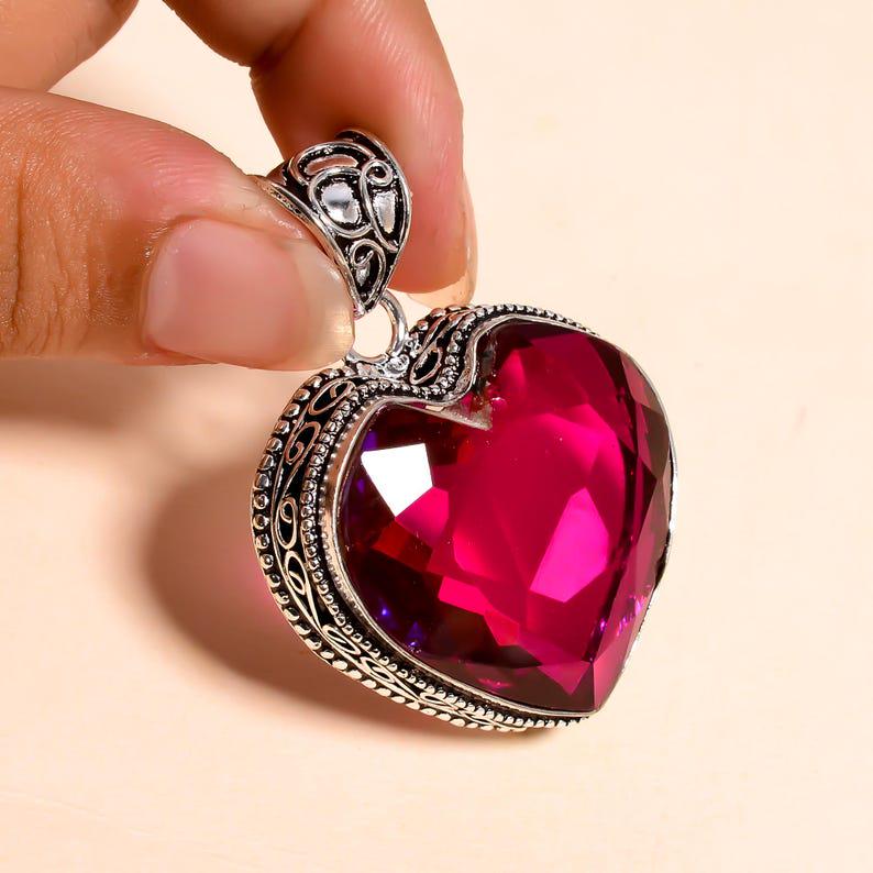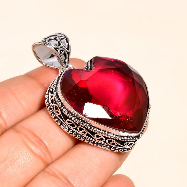 Ruby Red Heart Pendant Necklace Sterling Silver | Large Red Gemstone Heart Pendant | Handmade Birthstone Jewelry Gift for Women"