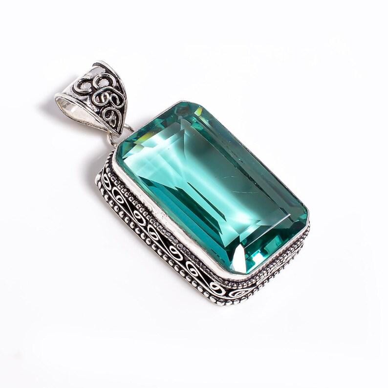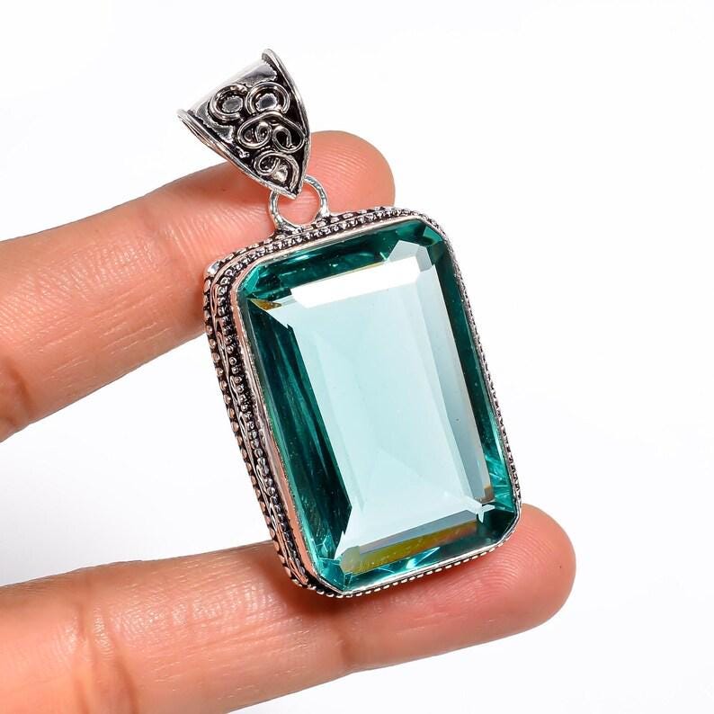 Aqua Blue Crystal Pendant Necklace • Vintage Boho Silver Statement Jewelry • Healing Gemstone Gift for Women • Handmade Rectangular Pendant"